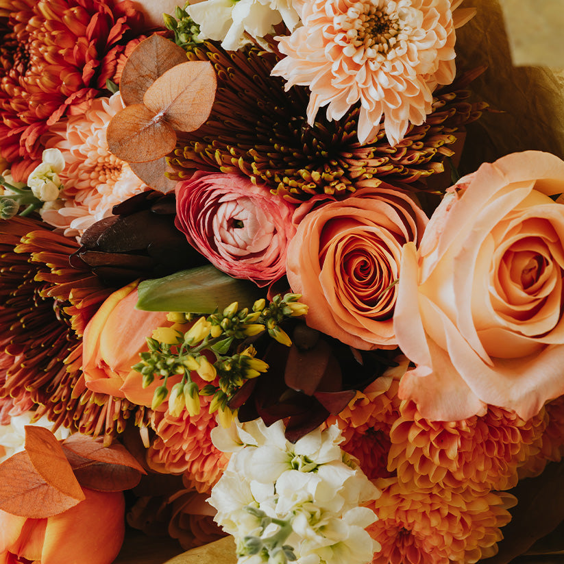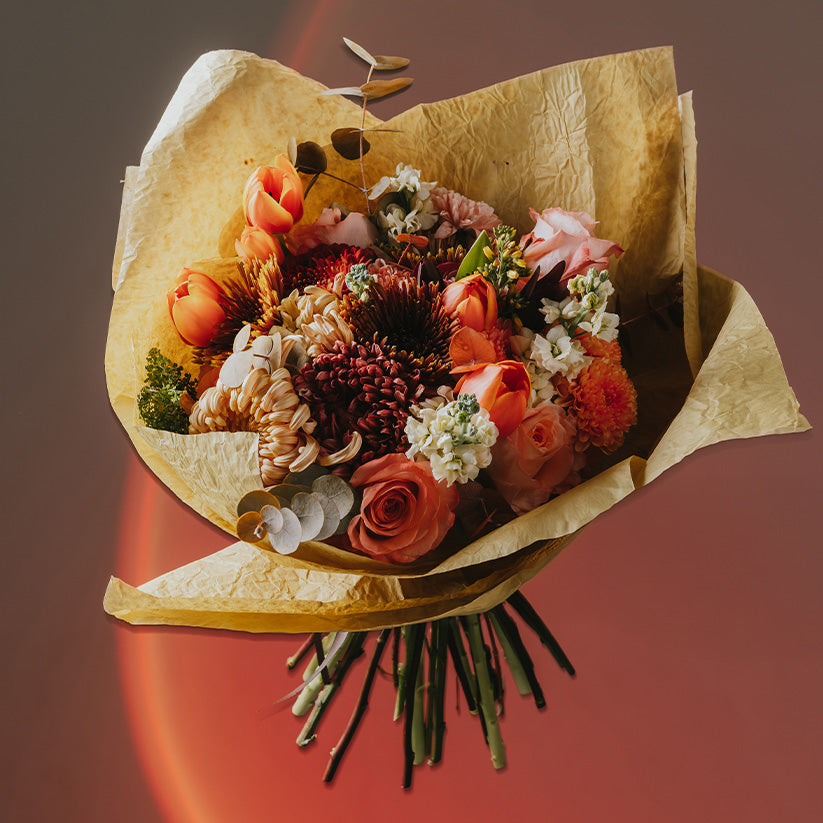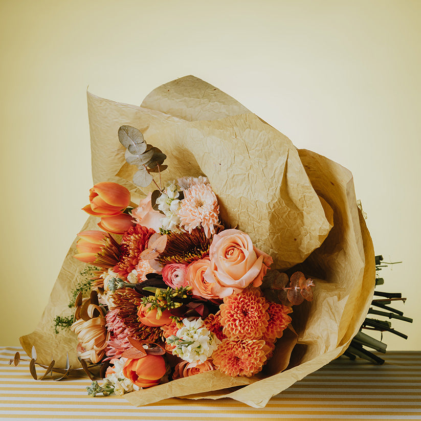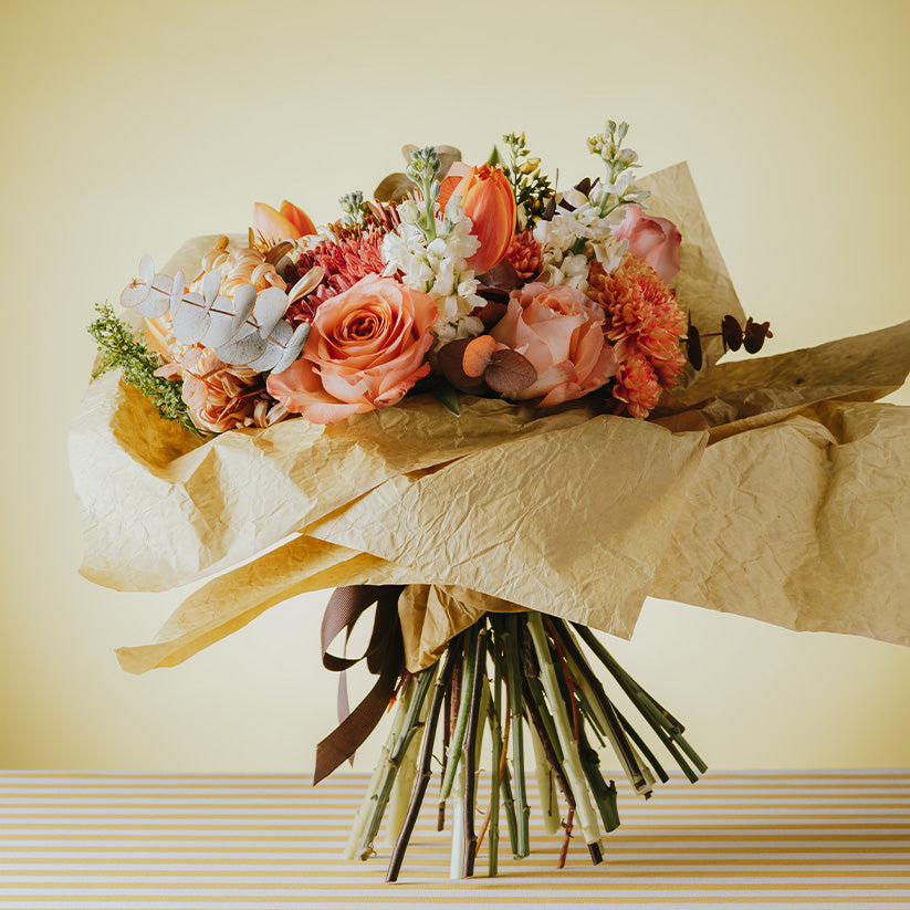 Dokulu kraft kağıtla çabasızca sarılmış, güneşin renklerinde, alıcısını kış günü yüzüne sıcak güneş vurmuş gibi gülümsetecek çiçek buketi!