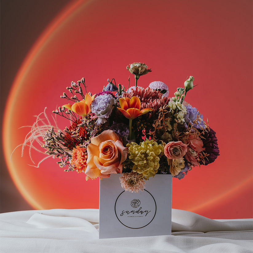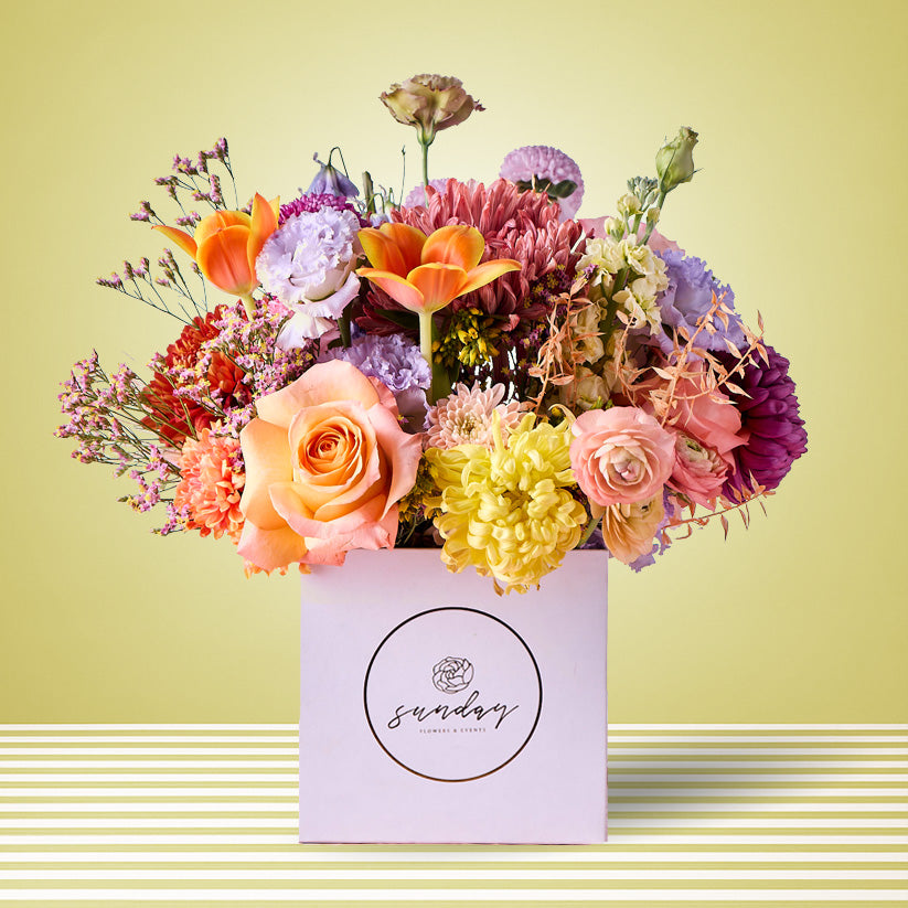 Sunday logo baskılı kare beyaz kutunun içinde kırmızı, turuncu, sarı, yeşil, mavi, lacivert ve mor çiçeklerle hazırlanan, alıcısında fantastik bir gökkuşağı görmüş hissi yaratacak o aranjman!