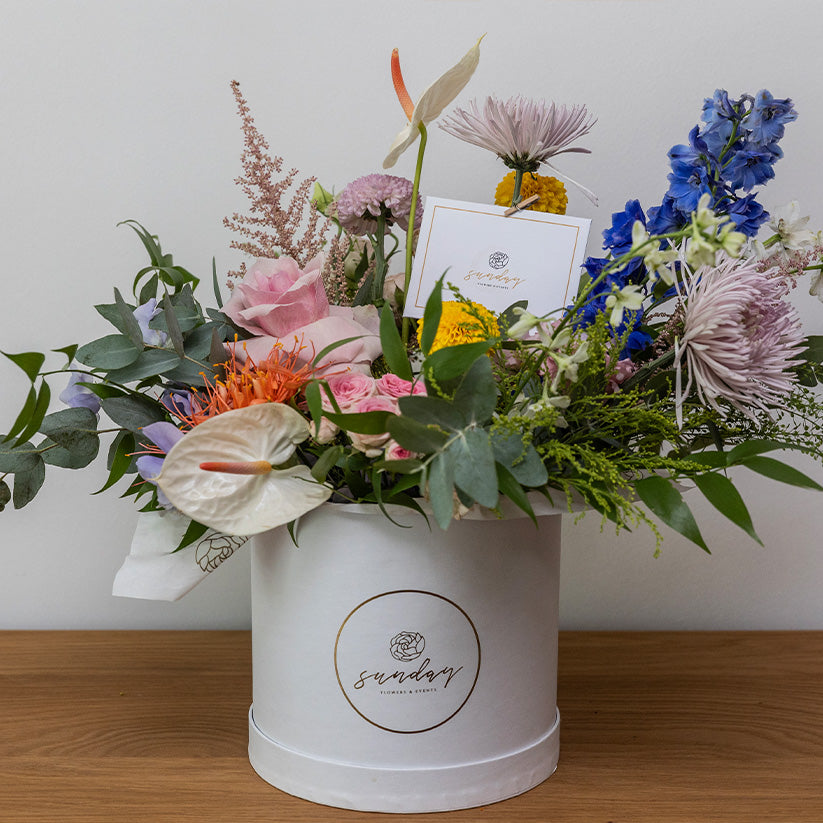 20x20 cm çaplı silindir Sunday logolu kutu ile paketlenen, silindir cam vazo içerisinde renkli mevsim çiçekleri ve taze doldurucu bitkilerle hazırlanan bir demet Sunday güzelliği. Sevdiğinize / kendinize neşe ve enerji vermek için şahane bir seçenek!