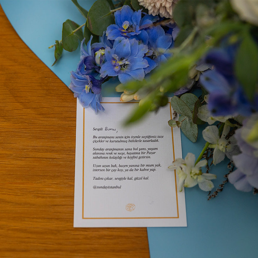 Mevsimin özenle seçilmiş mavi, mor, lila gibi soğuk renk çiçeklerinden ve taze doldurucu bitkilerinden oluşan, özel paketleme kağıtlarıyla hazırlanan Sunday buketi. Her gün doğumunda olduğu gibi yeni başlangıçlara ithafen anlamlı bu buket için siparişinizi oluşturun!